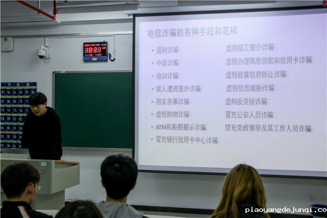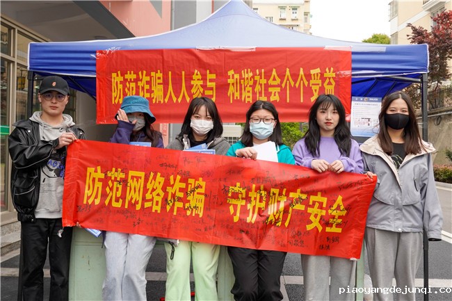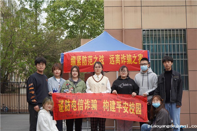 本次主题教育活动分宣传和宣讲两个部分组成,在天堂校区男、女生宿舍楼前悬挂标语、派发防诈骗知识宣传资料、横幅签名及“防诈骗”语录征集,同时邀请学校防诈骗宣讲团成员举办讲座,鼓励学生学习防骗知识,提高防骗能力,遇到实际问题,忌盲目,多思考。