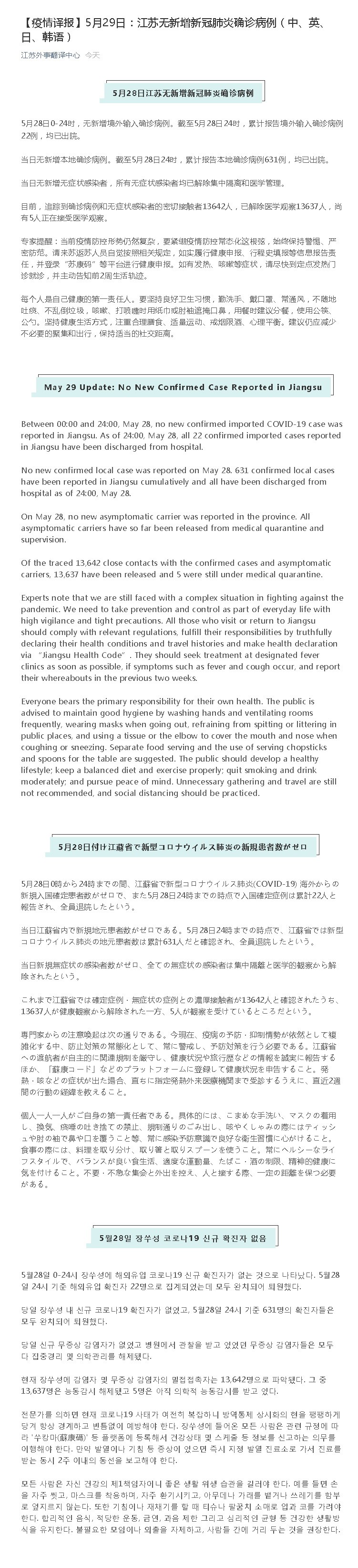 May 29 Update: No New Confirmed Case Reported in Jiangsu