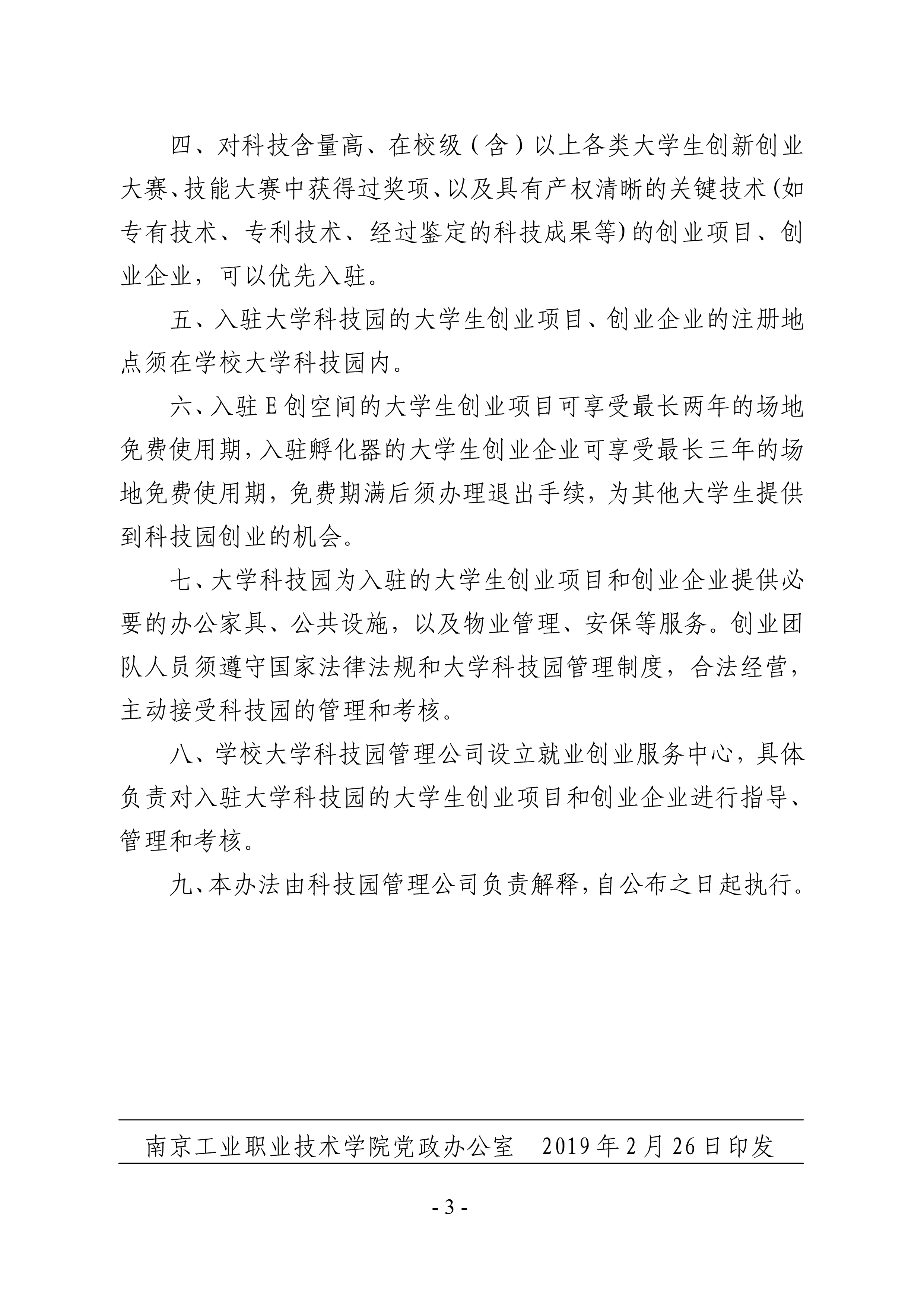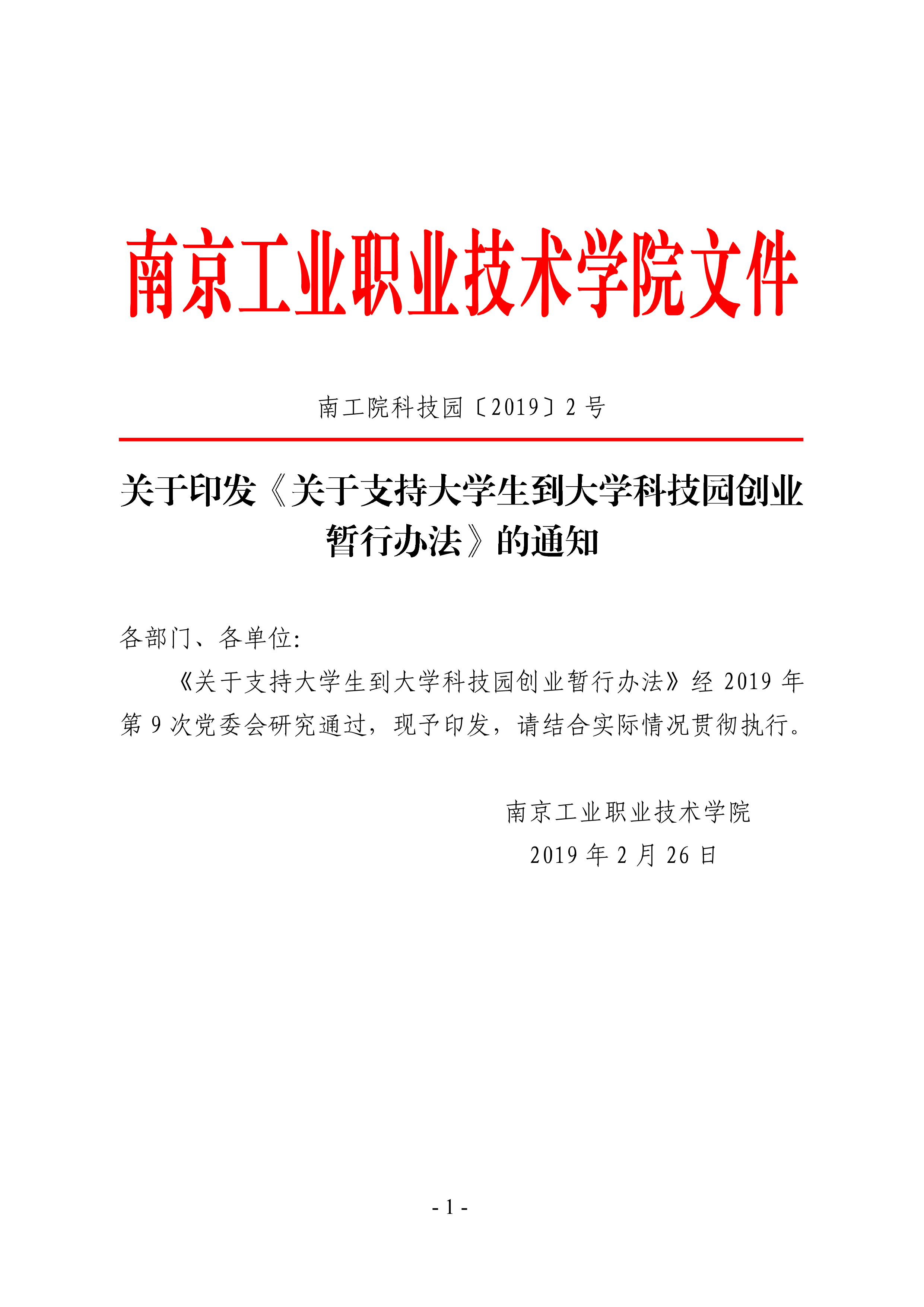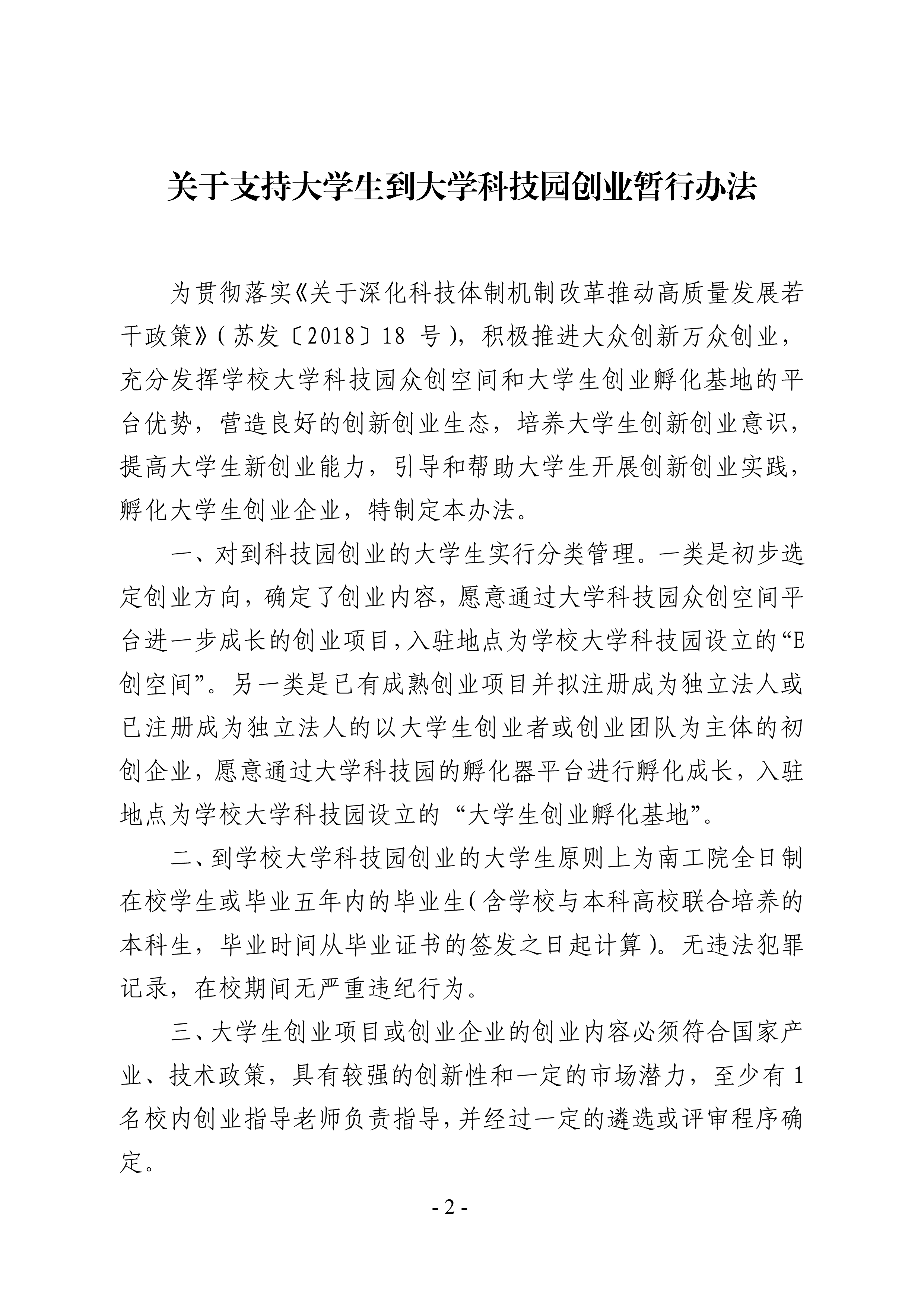 南工院科技园〔2019〕2 号关于印发《关于支持大学生到大学科技园创业暂行办法》的通知