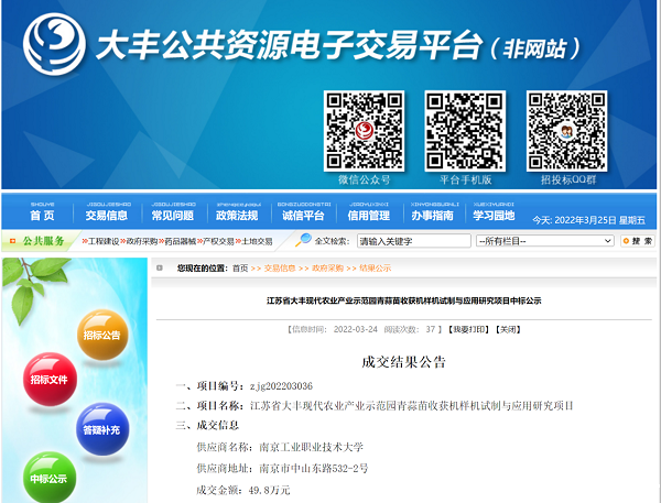 2022年3月24日,江苏省大丰公共资源电子交易平台发布成交信息,江苏省大丰现代农业产业示范园青蒜苗收获机样机试制与应用研究项目(项目编号(zjg202203036),供应商名称:csgo直播比赛官方平台;成交金额:49.8万元。