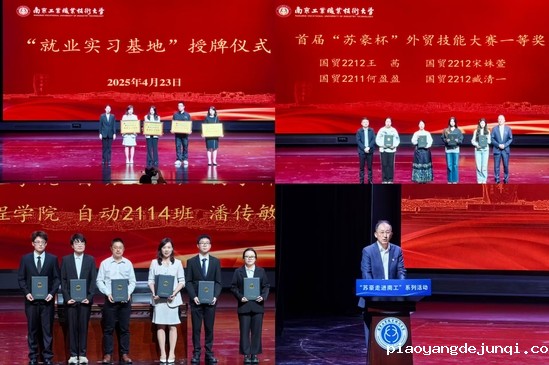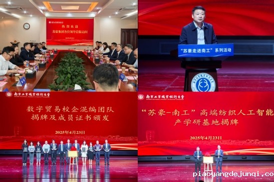 徐雨祥与高宏彦共同为数字贸易校企混编团队揭牌。该团队由苏豪集团5位企业导师及商务贸易学院5位教师联合组成,未来将聚焦跨境电商、数字营销等领域培养复合型贸易人才。徐雨祥与高宏彦共同为“苏豪-南工”高端纺织人工智能产学研基地揭牌,该基地的建立将聚焦人工智能与纺织业融合,推动技术创新与产业升级。徐雨祥和高宏彦等校企相关负责人为前期在首届“苏豪杯”外贸技能大赛获奖的20位同学颁奖。