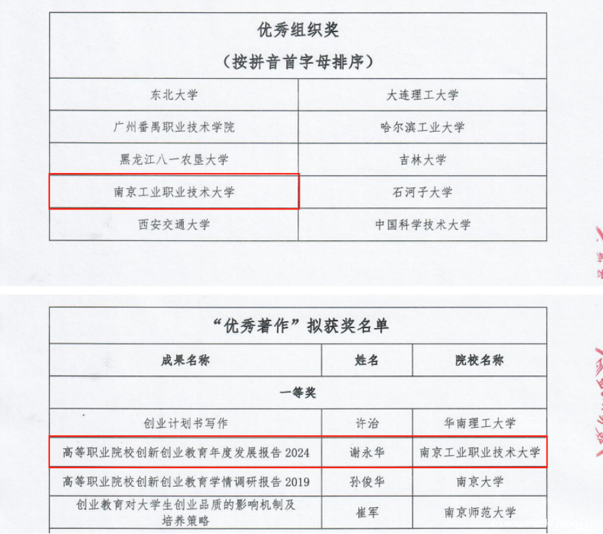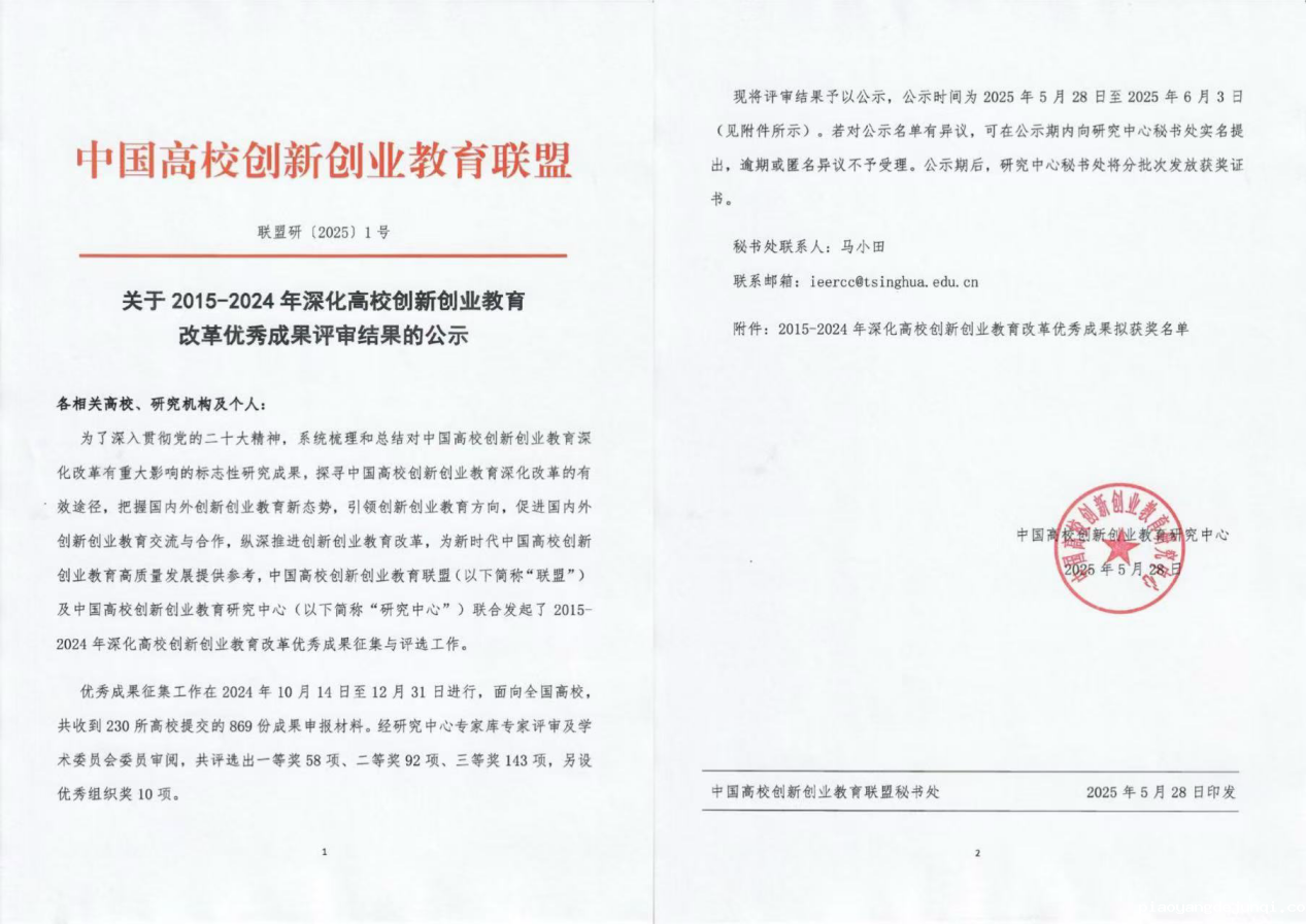 近日,中国高校创新创业教育联盟公布了《2015—2024年深化高校创新创业教育改革优秀成果评审结果的公示通知》,我校推荐的四项双创成果荣获2015-2024年深化高校创新创业教育改革优秀成果认定。其中,《高等职业院校创新创业教育年度发展报告2024》荣获优秀著作一等奖、《全国高职院校“同上一门创新实践课”系列直播课》荣获优秀实践一等奖、《以高质量创新创业教育赋能高层次创新型技术技能人才培养与实践》荣获优秀实践三等奖、《〈创业基础〉职业本科通识课程》荣获优秀课程三等奖,我校获优秀组织奖。