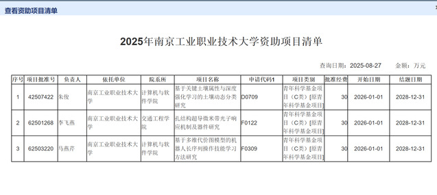 8月27日,国家自然科学基金委员会正式公布了2025年度国家自然科学基金项目立项结果,我校获批资助3项青年科学基金项目,其中计算机与软件学院2项、交通工程学院1项,资助总经费90万元。