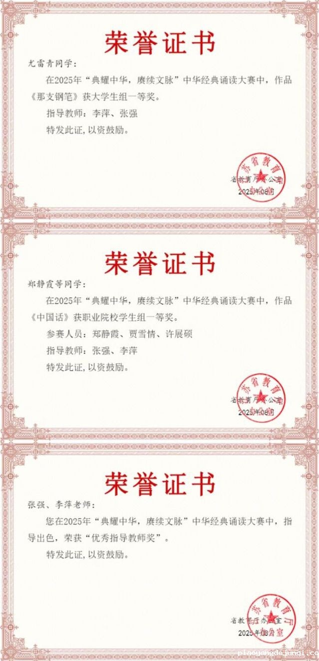 近日,由江苏省教育厅主办的2025年“典耀中华·赓续文脉”中华经典诵读大赛获奖名单正式公布,我校师生在比赛中取得优异成绩。由我校公共基础课部大学语文教研室张强、李萍两位老师指导,交通工程学院郑静霞、经济管理学院贾雪情、电子信息工程学院许展硕三位同学的诵读作品《中国话》以及艺术设计学院尤雷青同学的诵读作品《那支钢笔》在全省参赛选手中表现突出,分别荣获大学生组一等奖和职业院校组一等奖,并成功晋级全国决赛。两位老师均获得优秀指导教师称号。