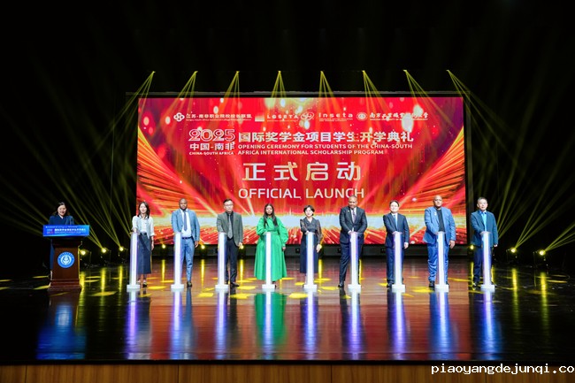 在全场倒数声中,中南双方领导将手共同放在启动柱上,伴随灯光点亮,中国-南非国际奖学金项目正式启动。随后,我校及兄弟院校领导为南非优秀留学生代表佩戴校徽,寓意他们正式成为中国校园的一员。