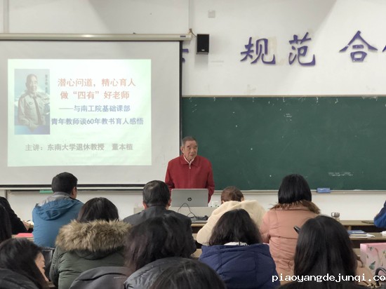 2月27日,公共基础课部特邀东南大学退休教师董本植教授给全体老师举办“潜心问道,精心育人,做‘四有’好老师”讲座,开展师德师风教育活动。享受国务院特殊津贴、现年85岁的董老师语重心长地与老师们分享了自己从教60年的感悟,一是要热爱教师工作,二是要精心静心教书育人。他将自己60年的教师生涯凝结为一个关键词——“热爱”。他回忆了自己如何与教育结缘,如何兢兢业业奋战在教育战线,如何在退休后、即使在80岁高龄、仍然继续发光发热、坚守在教学一线、不遗余力“塑造学生”、为党和国家培养合格的建设者与接班人等一系列经历,老师们聆听后非常感动,对教育事业又有了更深层次的认识与理解。董老师还介绍自己如何紧跟时代、关心时政、及时更新和精心设计教学内容、以及在七八十高龄的时候、在零基础的状态下学习做PPT课件、学习运用多媒体手段增强教学效果,他还介绍自己如何在课上以情动人感染学生,如何在课后走近学生、与生交友、帮助学生。在董老师朴实的语言里,老师们感受到了他热爱生活、热爱教育、热爱学生的情怀,以及他生命不息、授业不止、三尺讲台、不懈耕耘的宝贵精神,深受启发和教育。