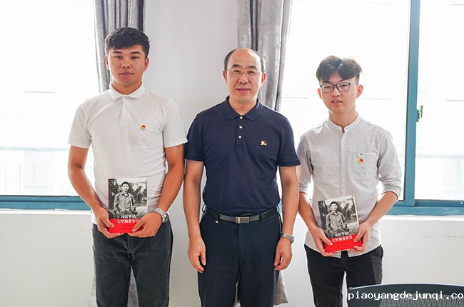 同时,霍雄飞副校长深切寄语我校2019年西部计划志愿者李康、甫尔开提.亚尔买买提同学,赠送理论学习书籍《习近平的七年知青岁月》并合影留念。