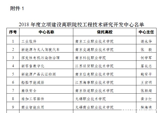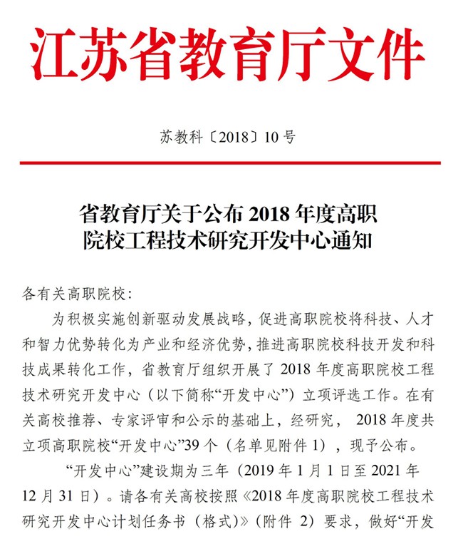 根据《江苏高等职业技术院校工程技术研究开发中心管理办法(试行)》的有关规定,江苏省教育厅开展了2018年度江苏高职院校工程技术研究开发中心遴选评审工作。我校由谢永华教授主持、依托计算机与软件学院为主体并联合华为及北京百度网讯组织申报的“工业软件工程技术研究开发中心”获立项支持。这是继“江苏省精密制造工程技术研究开发中心”、“江苏省传网工程技术研究开发中心” 立项后,南工院第三个获批的江苏省高校工程技术研究开发中心的项目,加上“江苏省风力发电工程技术研究开发中心”(协同创新中心),我校已建有省级工程技术研发平台四个,是江苏省工程技术研究开发中心最多的高职院校。