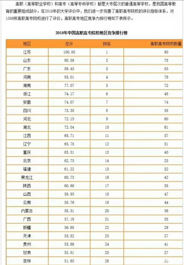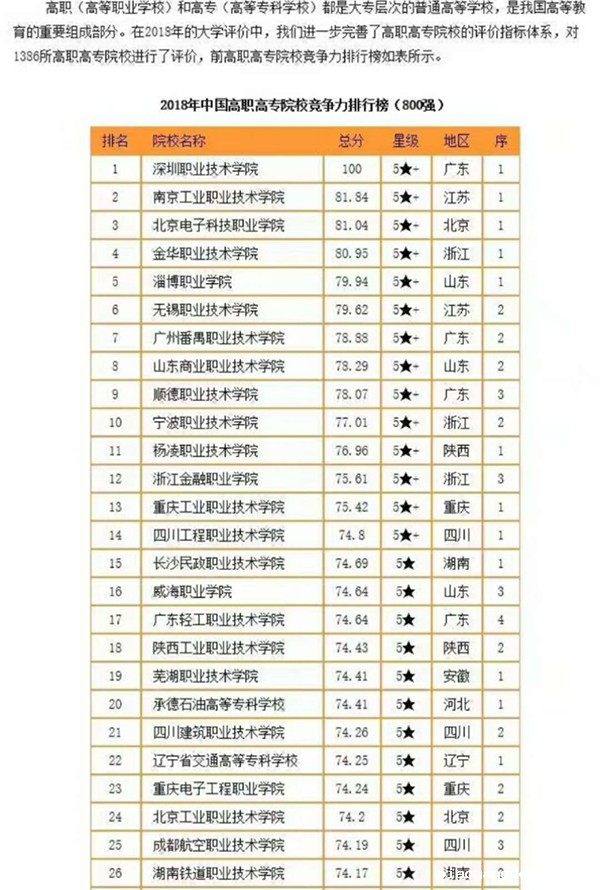 《中国大学及学科专业评价报告(2018)》由杭州电子科技大学中国科教评价研究院(CASEE)、武汉大学中国科学评价研究中心(RCCSE)、中国教育质量评价中心和《中国科教评价网》联合研发。共评定出16类共计673个排行榜。高职(高等职业学校)和高专(高等专科学校)都是大专层次的普通高等学校,是我国高等教育的重要组成部分。在2018年的大学评价中,进一步完善了高职高专院校的评价指标体系,全面、系统、客观、公正地评价了中国1386所高职高专院校的实力和水平。