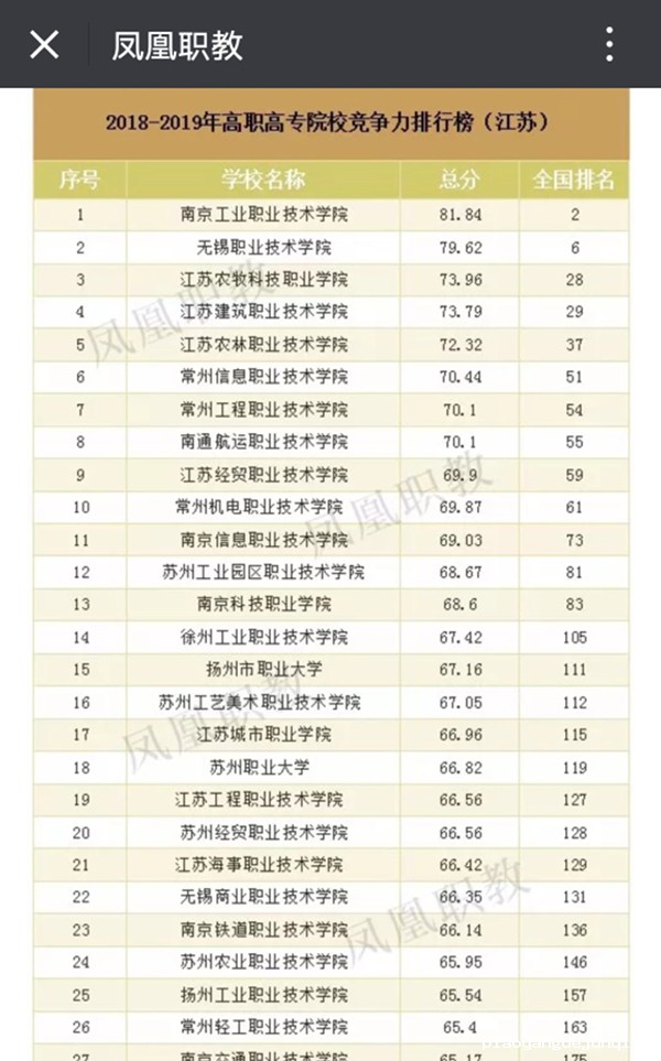 近日,《中国大学及学科专业评价报告(2018)》正式发布,在全国1386所高职高专院校中,我校位列第二,再一次跻身中国高职高专院校竞争力排行榜前十强,并比去年上升2名。在2018—2019年高职高专院校竞争力排行榜江苏院校中名列第一。