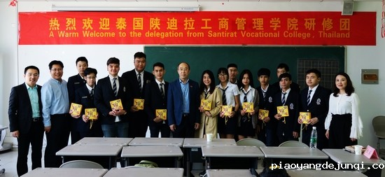 为欢迎泰国陕迪拉工商管理学院13名学生来我校研修,5月4日上午,欢迎仪式及研修开班典礼于乐群楼528教室隆重举行。我校副校长霍雄飞,国际合作与交流处、商务贸易学院、国际教育学院相关负责人和学生代表参加了活动。