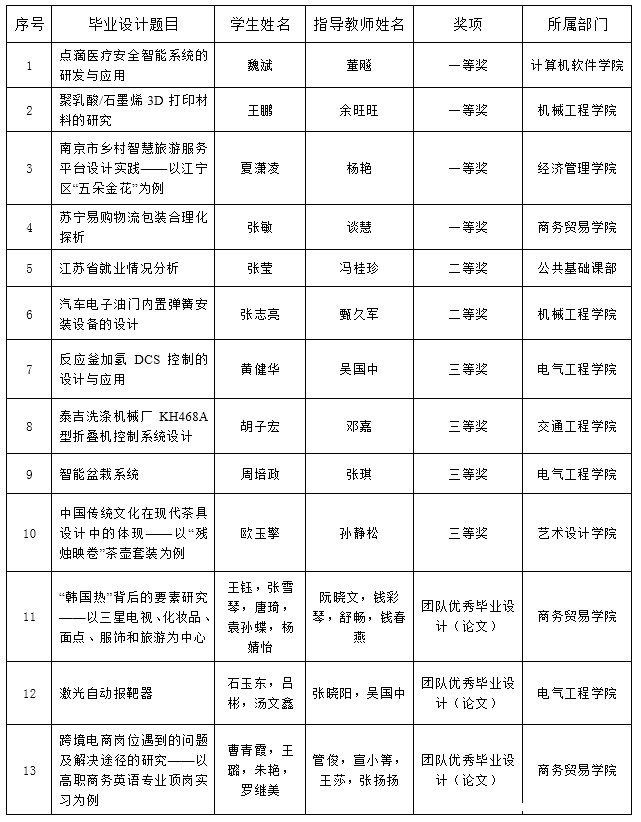 近期获悉,根据《省教育厅办公室关于做好2016年普通高校本专科毕业设计(论文)评优与抽检工作的通知》(苏教办高〔2016〕7号)要求,学校创新毕业设计省级推优办法,在学校推荐的基础上,经专家评审、结果公示和省教育厅审定等程序,我校所推荐参加普通高校本专科毕业设计(论文)省级评选的十三篇论文(个人申报10项,团体申报3项),获得个人一等奖4项,二等奖2项,三等奖4项,团体奖三项,获奖率100%,成为一等奖获奖量和获奖总数最多的高职院校,名列全省首位,创学校历史新高。