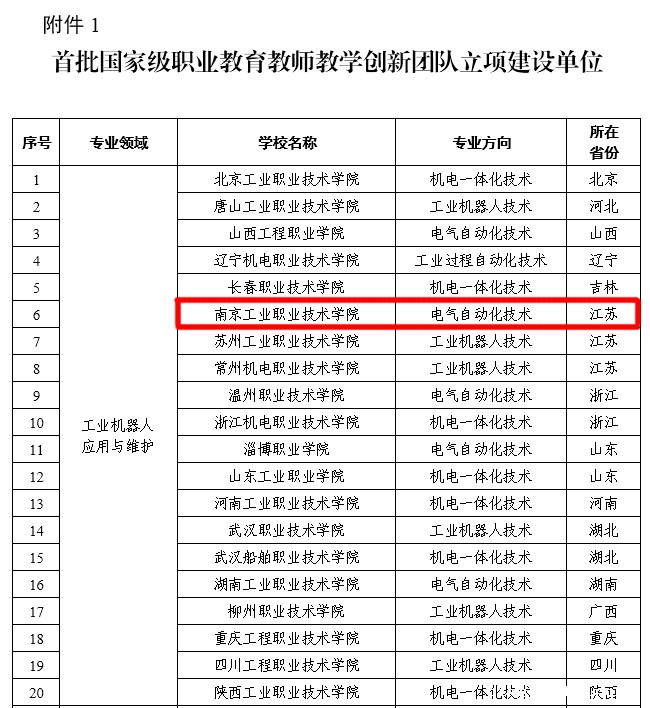 日前,教育部发布《教育部关于公布首批国家级职业教育教师教学创新团队立项建设单位和培育建设单位名单的通知》(教师函〔2019〕7号),南京工业职业技术学院电气自动化技术专业教学团队成功入选。