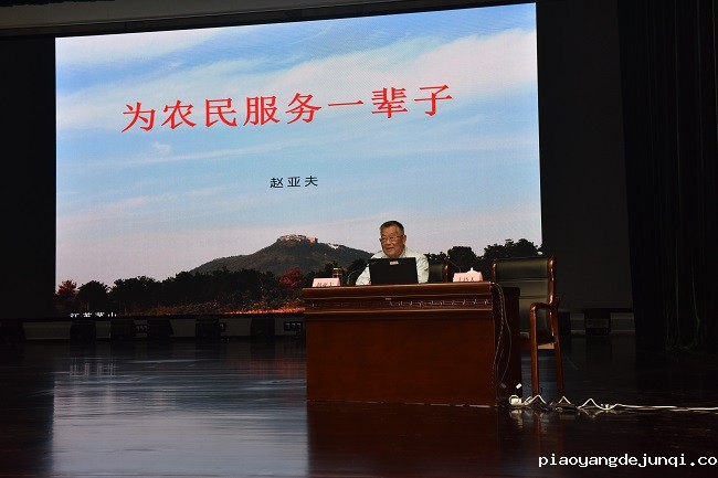 报告会上,赵亚夫以《为农民服务一辈子》为题,声情并茂地讲述了自己从小开始逐步树立信仰,牢记使命,从事三农工作近60年来为农民服务的情况和体会。他信守“做给农民看,带着农民干,帮助农民销,实现农民富”的诺言,让千万亩土地生金长银,使千万户农民脱贫致富,赢得了“要致富、找亚夫,找到亚夫准能富”的美誉。他凭着对农业、农村和农民的热爱,在破解“三农”问题的道路上探索前行,帮助戴庄村大力培养职业农民,打造现代农业,实现美丽乡村。