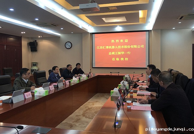 12月10日上午,江苏汇博机器人技术股份有限公司王振华总裁一行来校交流,我校党委委员、副校长崔新明及科技处、发展合作处、机械工程学院等相关部门负责同志接待了来宾。