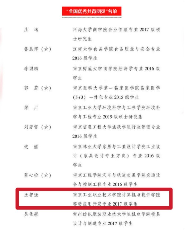 为表彰先进,宣传先进,激励全国团员、团干部和各级团组织奋发有为、再创佳绩,近日,共青团中央决定,授予张美玲等505名同志“全国优秀共青团员”称号,“全国优秀共青团员”是共青团中央授予团员、团干部和基层团组织的最高荣誉。共青团中央日前下发通知,决定在2020年“五四”期间集中对先进个人和先进集体进行表彰,我校计算机与软件学院移动1723班王智强同学荣获“全国优秀共青团员”称号。