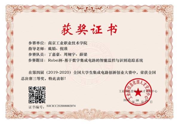 8月21日-8月23日,第四届全国大学生集成电路创新创业大赛(简称:集创赛)在南京信息工程大学进行全国总决赛,我校航空工程学院“俊宇飞梁”战队作为唯一一支专科队伍,一路披荆斩棘挺进总决赛,最终获得全国三等奖的好成绩。该项比赛是由工业和信息化部人才交流中心主办的面向全国高校的重要赛项。