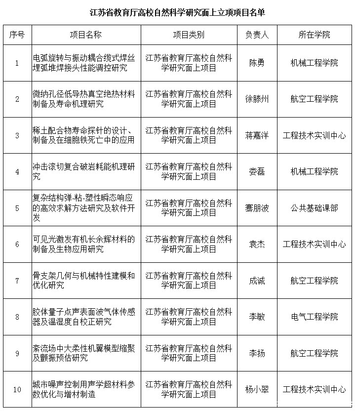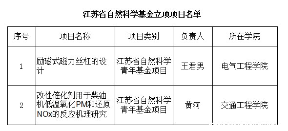 在此前江苏省科技厅、教育厅公布的江苏省自然科学基金和江苏省高校自然科学研究立项名单中,我校荣获江苏省自然科学基金青年基金项目2项、江苏省高校自然科学研究面上项目10项。