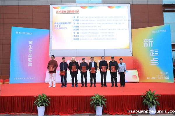 中国工艺美术大师、世界非物质文化遗产南京云锦国家级传承人金文,江苏省书法家协会副主席、南京财经大学中国书画艺术研究所所长仇高驰教授,原光明日报社副社长、副总编,教育部中国人生科学学会副会长、国家一级美术师王林教授,南京师范大学美术学院绘画系主任吴维佳教授,中国绘画艺术研究院副院长、国家一级美术师、北京黄埔大学艺术学院黄亚伟教授,江苏省青年美术家协会副会长、江苏省民建书画院李业院长,江苏省中外文化交流协会副会长、江苏中亚书画院李江海院长,江苏晟诚环境艺术有限公司张琪玮董事长等8位艺术家为庆祝艺术设计学院师生作品联展开幕,向学院捐赠艺术作品8项,在开幕式上苏小冬为他们颁发了捐赠证书。
