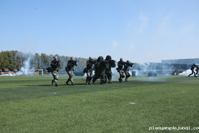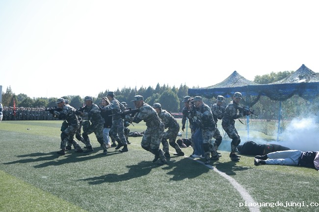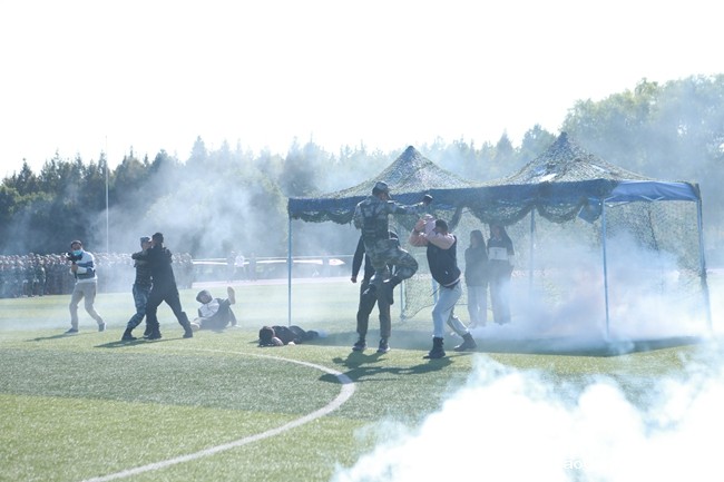 随后,2020级新生们分科目进行汇报表演。第一个表演科目是刺杀操,刺杀操是我们人民军队的传统表演项目,是近战歼敌的重要手段,随着音乐响起,杀声震天,一个个刺杀男儿精神抖擞,军容严整,一突一刺,一防一击,豪情满怀,尽显劲旅男儿时代风采。接下来的是军体拳科目表演,“1,2,3,4……”伴随着整齐而嘹亮的口号声,同学们列队跑步上场。出一拳,吼一声,同学们响亮的口号声喊出了气势,也振奋了精神。出拳、踢腿,一招一式都有模有样。同学们动作精炼,节奏分明,淋漓尽致的展现出了军人的风貌。紧跟着的是巾帼不让须眉的匕首操表演,女生们动作刚劲有力、干脆利落,又帅又飒,军味儿十足。最后的战术表演燃爆全场!队员们在硝烟弥漫的模拟战场上,相互配合,相互掩护,成功“解救人质,救护伤病员”。分科目汇报表演,同学们以良好的精神风貌、整齐划一的动作和精彩震撼的军事技能表演向全场师生展示了当代大学生的青春风采和昂扬斗志,赢得了全场嘉宾和师生的阵阵掌声,也为两周的军训生活交出了满意的答卷。
