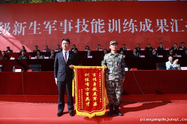 军训成果汇报大会上,校党委副书记、校长谢永华代表学校向承训部队中国人民解放军73211部队副参谋长李林赠送了“言传身教展军姿,训练有方育英才”的锦旗,感谢解放军73211部队对我校军训工作的大力支持。校党委委员、副校长霍雄飞宣读了军训先进集体和个人的表彰决定。学校领导和嘉宾为获奖的“军训先进连队”“优秀教官”“优秀教导员”等集体和个人代表颁奖。
