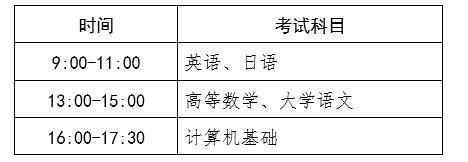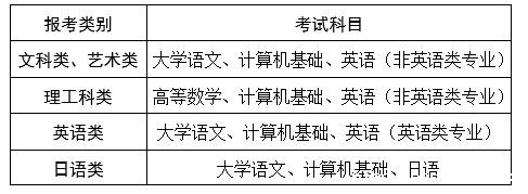 (2)大学语文科目考试内容为基础知识、阅读和写作,计算机基础科目考试要求为省级计算机等级考试一级水准,英语、日语、高等数学等科目考试要求均为高等学校专科二年级水准。
