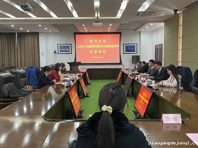 1月21日,省政府外事办公室亚洲处副处长王文荟一行3人来访我校,校党委副书记、校长谢永华,党委常委、副校长孙雁飞热情接待了客人,双方就合作事宜进行了洽谈。人事处、国际合作与交流处负责人参加接待。