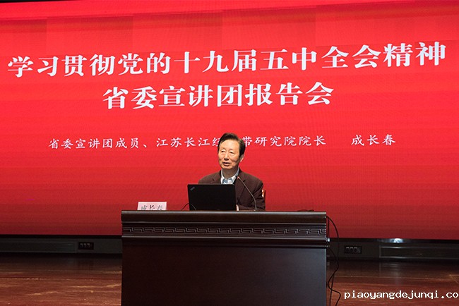 根据省委统一部署,学习贯彻党的十九届五中全会精神江苏省委宣讲团11月23日上午在我校宣讲党的十九届五中全会精神。省委宣讲团成员、江苏长江经济带研究院院长成长春教授作专题宣讲报告。学校领导班子成员,全体中层干部,机关全体教职工,辅导员,思政课教师,学校各级单位宣传员、信息员,学生干部和青年马克思主义者培训班成员代表等350余人在大学生创新发展中心礼堂共同聆听报告。宣讲会由党委书记吴学敏主持。