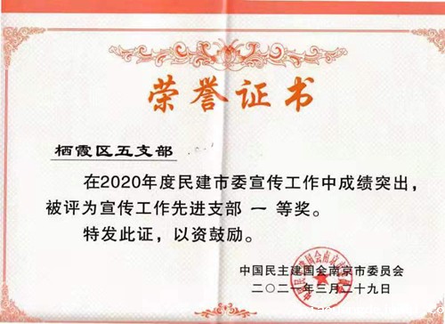 在近日民建南京市委的表彰中,民建南工支部获“2020年度宣传工作先进支部”;支部王红军、吴鑫奇两位同志分别获宣传工作先进个人一等奖和三等奖,吴鑫奇等撰写《继往开来明使命,砥砺前行破难题—对民建基层组织在新时代更好发挥作用》获年度优秀理论成果一等奖,王红军获信息工作先进个人二等奖。