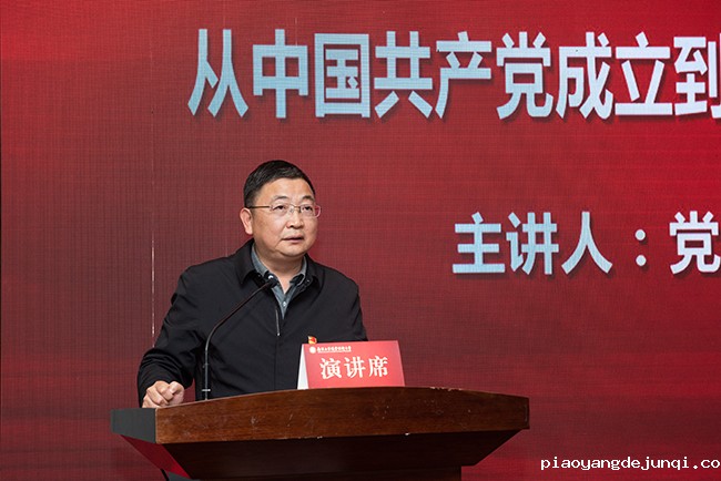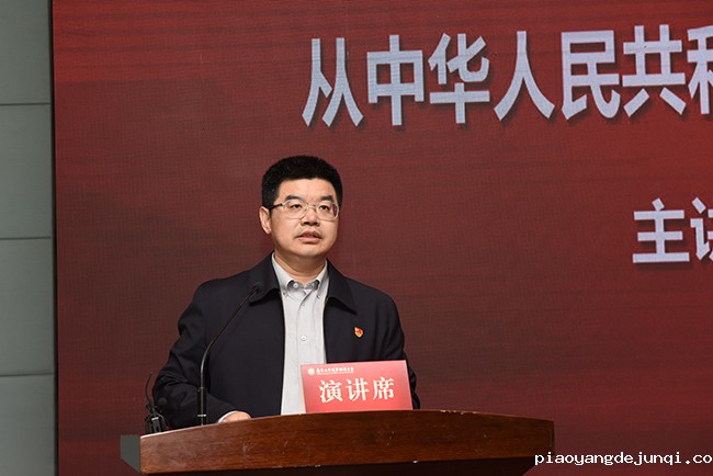 在观看《中华人民共和国中央人民政府成立典礼》原始影像后,党委副书记王伟作“从中华人民共和国成立到社会主义革命与建设”读书分享。他以“奠基”和“转折”为分享关键词,从“一场伟大的开国盛典”“一场伟大的正义战争”“一次伟大的社会变革”“一次灾难深重的内乱”和“一次伟大的历史转折”出发,回顾了新中国成立、抗美援朝战争、社会主义改造等重要历史节点,讲述了中国共产党领导全国人民完成社会主义革命、开展社会主义建设,实现兴国大业的光荣历史。他提出,社会主义革命和建设时期产生的两弹一星精神、大庆精神、铁人精神、雷锋精神、红旗渠精神等都是中华民族的宝贵精神财富,值得我们永远学习和弘扬。