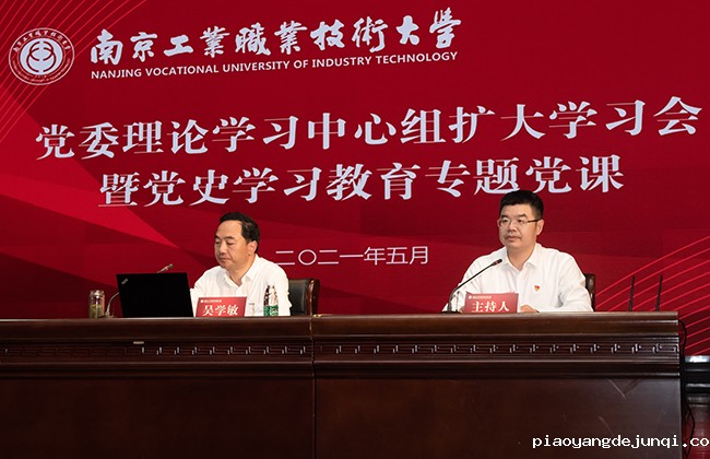 为推动党史学习教育持续走深走实,引导广大党员师生进一步提升党性修养、激发政治热情、强化使命担当,根据省委、省委教育工委和我校党史学习教育实施方案安排,5月14日下午,党史学习教育专题党课暨党委理论学习中心组学习扩大会在大学生创新发展中心举行,校党委书记吴学敏以《学辉煌党史感悟初心使命 铭红色校史汲取奋进力量》为题,为全校党员师生讲授专题党课。省委教育工委派出第一指导组组长、南京艺术学院原党委书记管向群,指导组成员、南京工程学院团委副书记魏先龙与会指导,全体在校校领导、党委常委、中层干部、党支部书记、辅导员、党员师生代表、党校学员和入党积极分子代表现场参会,其他教职员工通过企业微信线上学习。党课由党委副书记王伟主持。