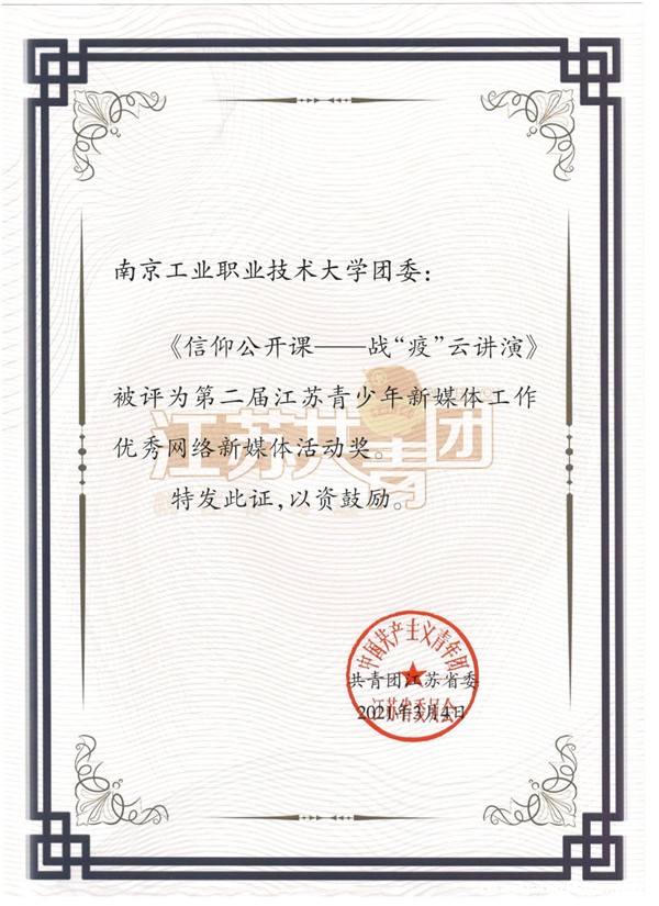 近日,由中共江苏省委网信办指导,共青团江苏省委、江苏青少年新媒体联盟主办的第二届江苏青少年新媒体工作优秀项目奖评选结果正式揭晓。经过专家组评审、现场答辩和网络公示等环节,我校团委荣获“新媒体建设先进单位”;“信仰公开课——战‘疫’云讲演”项目荣获“优秀网络新媒体活动奖”。