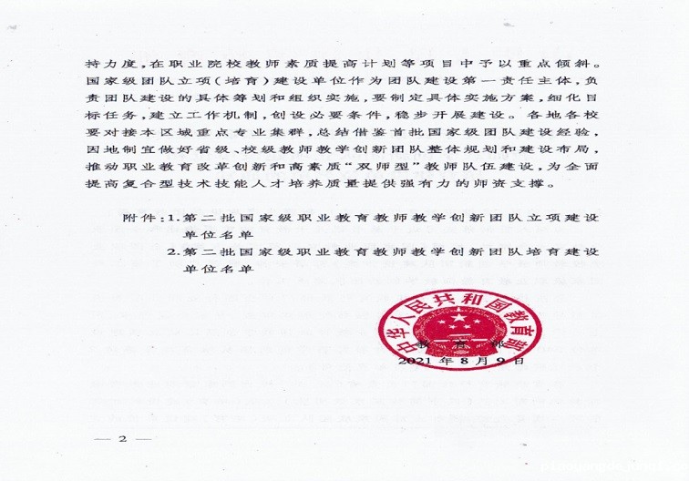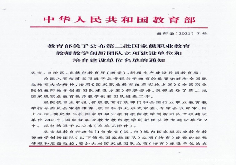 近日,教育部发布了《教育部关于公布第二批国家级职业教育教师教学创新团队立项建设单位和培育建设单位名单的通知》(教师函〔2021〕7号),我校“机械电子工程技术”教师团队入选。这是我校继“电气自动化技术”教师团队获得首批国家级职业教育教师教学创新团队立项后,成功立项的第二个国家级教师团队。