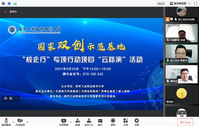 为贯彻落实国家发展改革委、教育部、国资委、人社部等部委联合印发的《关于深入组织实施创业带动就业示范行动的通知》(发改办高技〔2021〕244号)、《关于开展双创示范基地创业就业“校企行”专项行动的通知》(发改办高技〔2021〕310号)文件精神,加强与企业类国家双创示范基地的协作和对接,助力师生双创项目成长,9月24日下午,csgo直播比赛官方平台与中国电子科技集团、中国电信集团、荣事达集团、猪八戒网等企业类双创示范基地联合开展“校企行”专项行动项目“云路演”活动。中国电子科技集团第十四研究所装备部副部长单东升、中国电信集团天翼创投投资总监徐瑾、荣事达集团助理总裁潘启文、猪八戒网八戒教育市场总监张蓓作为双创示范基地创业导师代表出席了本次活动并担任点评嘉宾。学校创新创业教育工作领导小组办公室副主任、创新创业学院副院长黄继平参加活动并致欢迎辞。