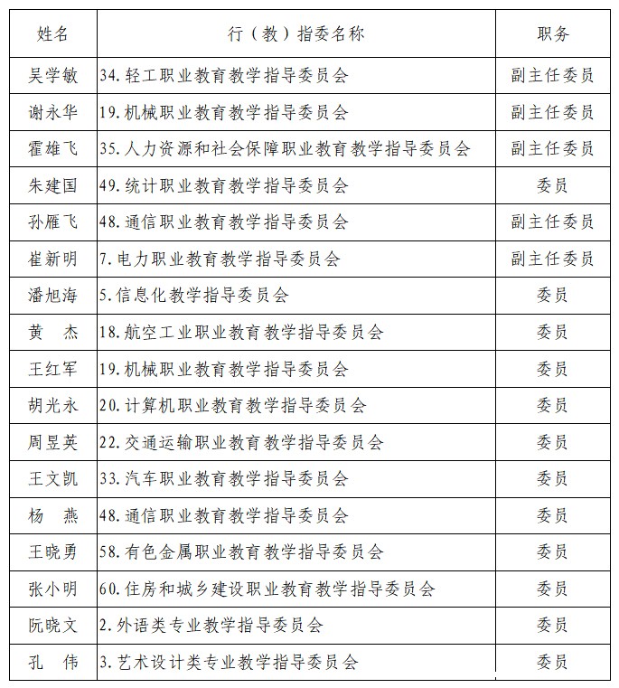 根据教育部日前公布的全国行业职业教育教学指导委员会(2021-2025年)、教育部职业院校教学(教育)指导委员会(2021-2025年)组成人员名单,我校有17位老师承担新一届行(教)指委委员,其中有5位老师担任行(教)指委副主任委员,担任行(教)委委员数量在全国院校中位列前三。