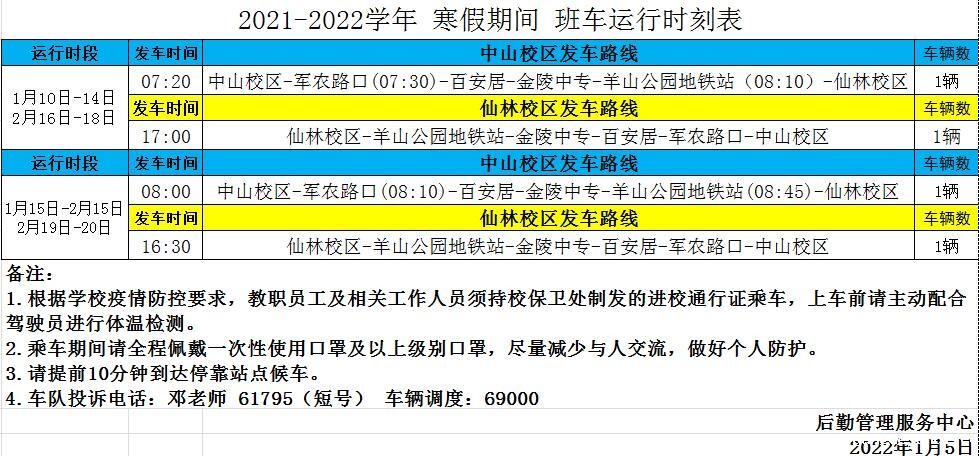 2021-2022学年寒假期间班车运行时刻表