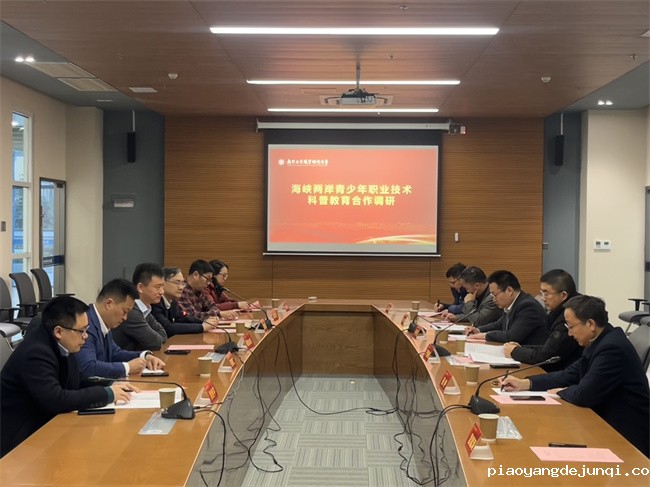 2021年12月30日下午,海峡两岸青少年职业技术科普教育合作调研会在我校顺利开展。江苏省科学技术协会党组成员、副主席李千目,科普部部长严道明,青少年科技交流中心主任龚一钦,国合中心主任张仲,企业创新服务中心主任吴科明,国合中心综合部部长宫斌涛,我校党委副书记、校长谢永华,党委常委、副校长潘旭海,相关部门负责人出席会议。本次会议由潘旭海主持。