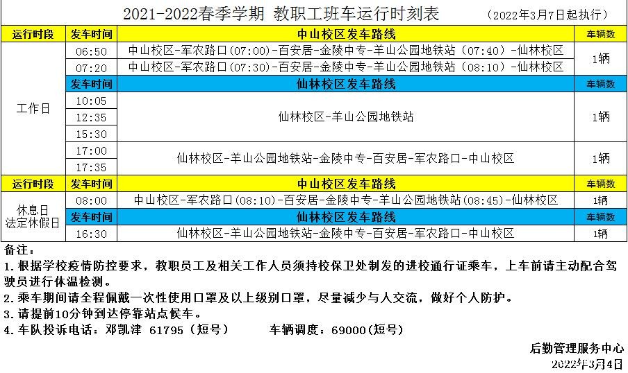 2021-2022学年春季学期教职工班车运行时刻表