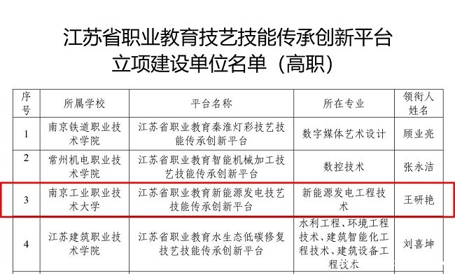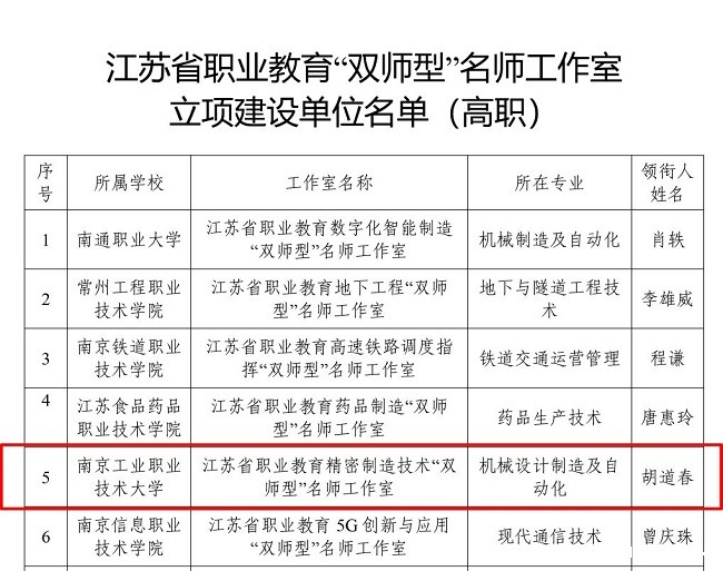 日前,省教育厅正式公布首批江苏省职业教育“双师型”名师工作室和技艺技能传承创新平台建设单位名单,我校由机械工程学院胡道春老师领衔的“江苏省职业教育精密制造技术‘双师型’名师工作室”和电气工程学院王研艳老师领衔的“江苏省职业教育新能源发电技艺技能传承创新平台”获批立项。