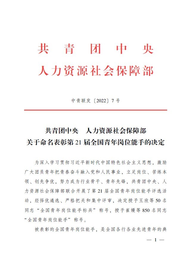 近日,共青团中央、人力资源社会保障部联合印发《关于命名表彰第21届全国青年岗位能手的决定》,我校机械工程学院机自2013班王美健同学被授予“全国青年岗位能手”称号。王美健在第十七届“振兴杯”全国青年职业技能大赛中获得车工赛项全国第六名的好成绩(指导教师:工程技术实训中心 赵荣幸、宋海潮),根据赛事成绩和综合表现,被江苏团省委、南京团市委推报为“全国青年岗位能手”候选人。全国青年岗位能手评选表彰是共青团中央、人力资源社会保障部共同组织开展的为党育人、为国育才的重要品牌工作,属于国家级一类赛事。自1994年启动实施至今已开展21届,此次被命名表彰的900名全国青年岗位能手及标兵,经择优遴选、严格把关、集中评审和社会公示产生,是各行各业职业青年的优秀代表。他们在科技强国主战场艰辛求索,在生产经营第一线突击攻坚,在技术革新最前沿精益求精,在为民服务本岗位勤勉工作,在社会服务各领域无私奉献,在技能竞技大舞台挥洒汗水,集中展现了新时代中国青年不懈奋斗、永久奋斗的精神风貌,为广大青年立起了标杆、作出了榜样。