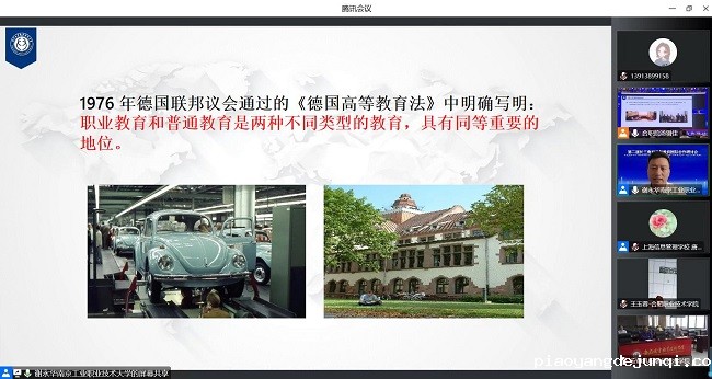 谢永华校长以《德国应用类高等教育发展研究及其对我国高职教育的启示》为题,从德国应用类高等职业教育浅析、国家关于职业本科大学的政策支持、我们的思考以及南工中德合作介绍四个方面进行阐述。他指出,德国应用类高等教育发展的成功经验可以成为我国的借鉴,一是标准引领,构建职业本科办学发展的制度基础,建立纵向衔接贯通的技术技能人才培养体系,搭建沟通高职专科和普通本科教育的“立交桥”,为构建中国特色的现代职教体系探路。二是职业导向,以技术应用型人才培养为办学定位,努力培养适应社会经济发展需要的应用型人才。三是双元协同,以产教融合为依托,合作培养高素质应用型人才。优化专业设置,适应区域经济社会发展和行业企业需求。四是双师结构,打造高水平结构化创新教育教学团队。五是国际合作,形成“标准对接—项目链接—课程衔接”的国际合作教育范式。我校开展雷竞技JJB与合作已有30年,创建了“标准引领、项目支撑、课程衔接、资源集成”的专业国际化建设模式,在国际合作人才培养、专业标准、教学资源建设与应用等方面取得了一定成效。