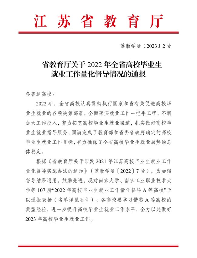 近日,江苏省教育厅发布了《关于2022年全省高校毕业生就业工作量化督导情况的通报》(苏教学函〔2023〕2号),我校被评为江苏省“2022年高校毕业生就业工作量化督导A等高校”。自省教育厅实施高校毕业生就业工作量化督导以来,我校已连续三年获评该项荣誉。