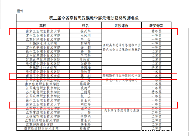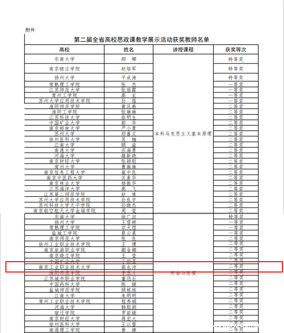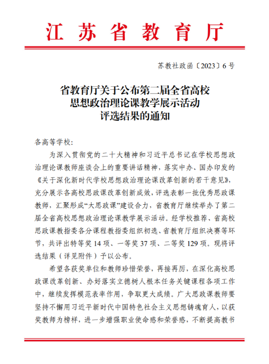近日,江苏省教育厅公布了江苏省第二届高校思想政治理论课教学展示活动的评选结果。我校徐兴华、魏彬、刘红梅、高永沛老师分别荣获《毛泽东思想和中国特色社会主义理论体系概论》特等奖、《习近平新时代中国特色社会主义思想概论》一等奖、《思想道德与法治》一等奖和《形势与政策课》二等奖。