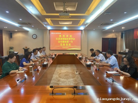 2023年7月4日,江苏省国际经贸学会会长郁冰滢、副会长兼秘书长邢冲、原秘书长丁育生、副秘书长凌新娟来访我校。我校党委常委、副校长孙雁飞,商务贸易学院院长阮晓文及骨干教师参加了本次会议。