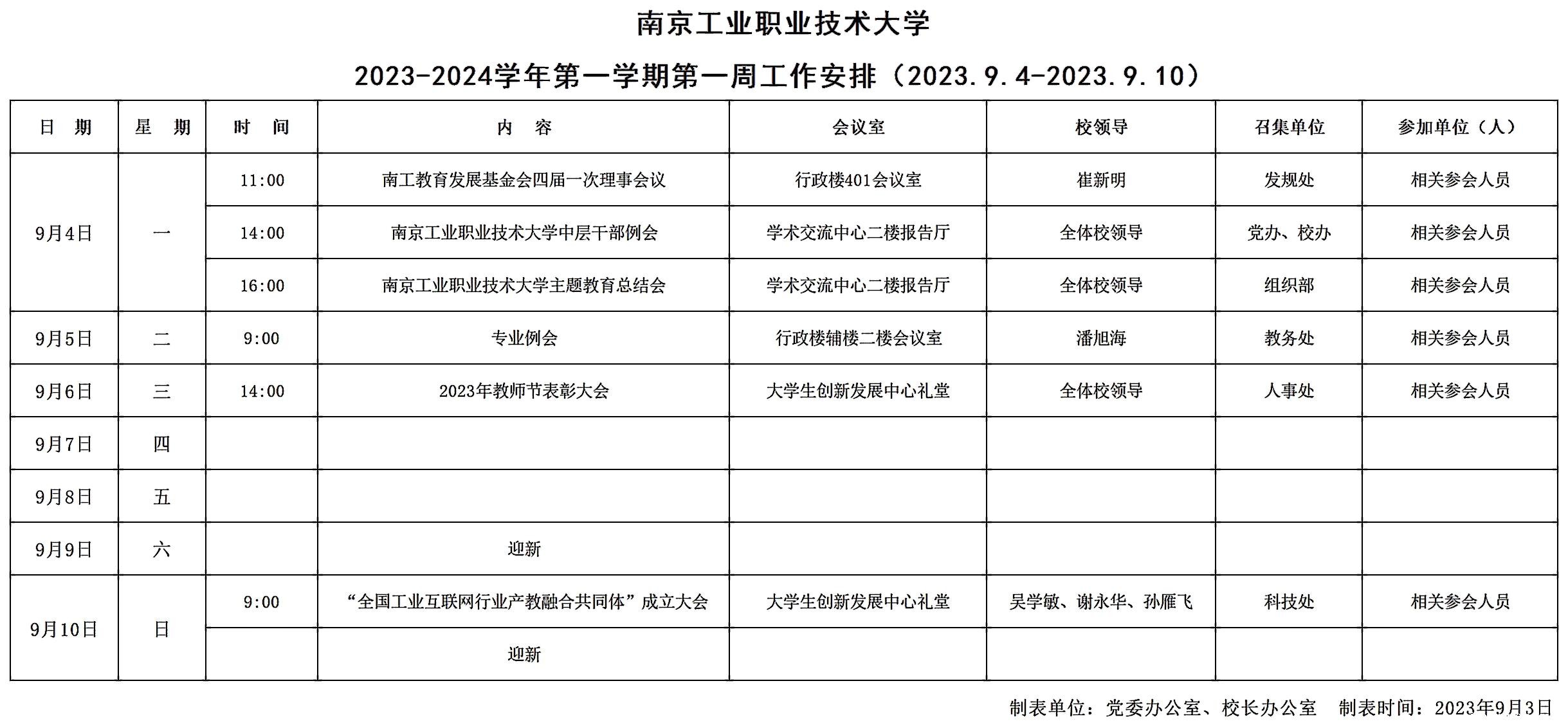 2023-2024学年第一学期第一周工作安排(2023.9.4-2023.9.10)
