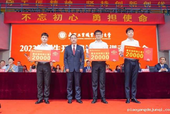 党委书记吴学敏为“黄炎培科创之星”获得者电气工程学院物联2021班苏鑫同学、自动2156班张文秀同学和航空工程学院电信2020班夏华兵同学颁发奖牌及证书。