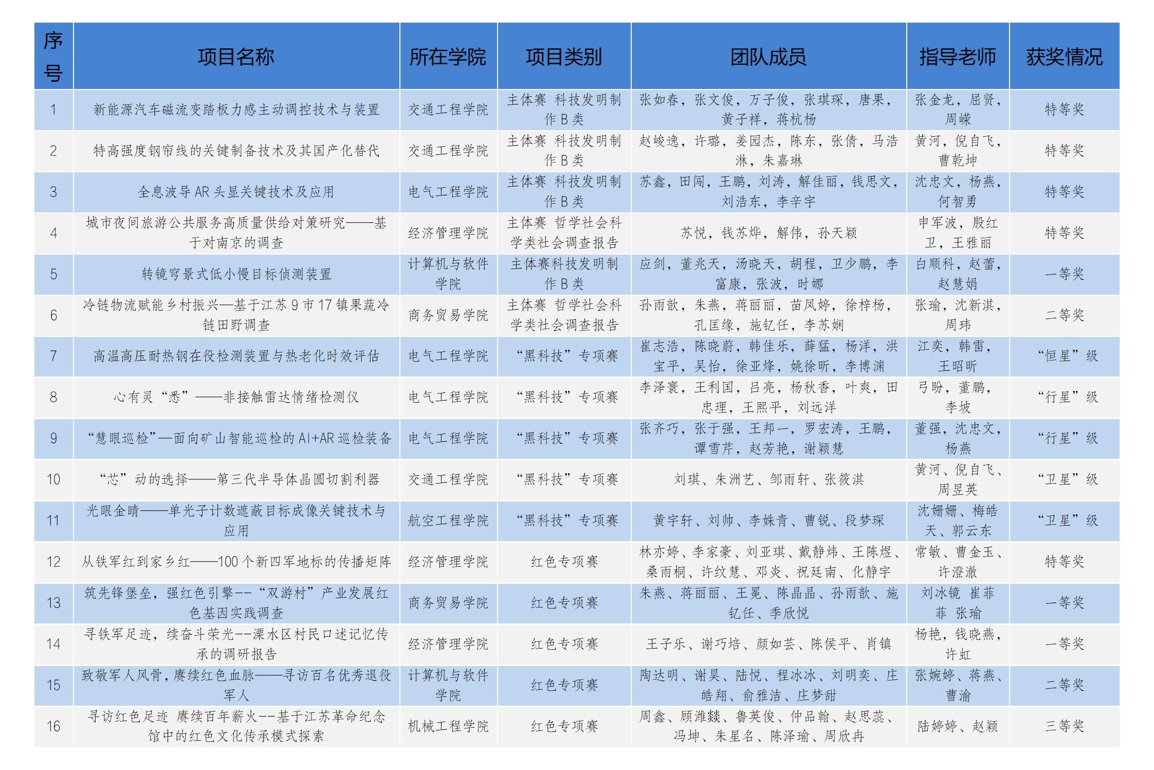 近日,第十八届“挑战杯”全国大学生课外学术科技作品竞赛“红色专项”赛江苏省选拔赛结果公布。至此,第十八届“挑战杯”课外学术科技作品竞赛系列赛项江苏选拔赛落幕。我校师生齐心合力,勇于拼搏,主体赛省级规定的6个参赛名额作品全部进入现场决赛,共斩获特等奖4项,一等奖1项,二等奖1项,其中2项作品参加本科组比赛获得一等奖1项,二等奖1项;在“红色专项赛”中,省级规定的5个参赛项目共获得特等奖1项,一等奖2项,二等奖1项,三等奖1项;“黑科技”专项赛中,省级规定的5个参赛项目共获得“恒星”级作品1项,“行星”级作品2项,“卫星”级作品2项。我校获得省赛“优胜杯”和“优秀组织奖”,获得江苏省职业院校最好成绩。