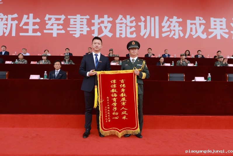 党委副书记、校长谢永华向承训部队赠送锦旗;党委常委、副校长魏萍宣读军训先进集体和个人表彰决定。校领导们依次为“军训先进个人”“优秀教官”“优秀指导员”“先进连队”“优秀参谋”获奖代表颁奖;电气工程学院通信2312班杨槟绮同学代表参训学生发言。