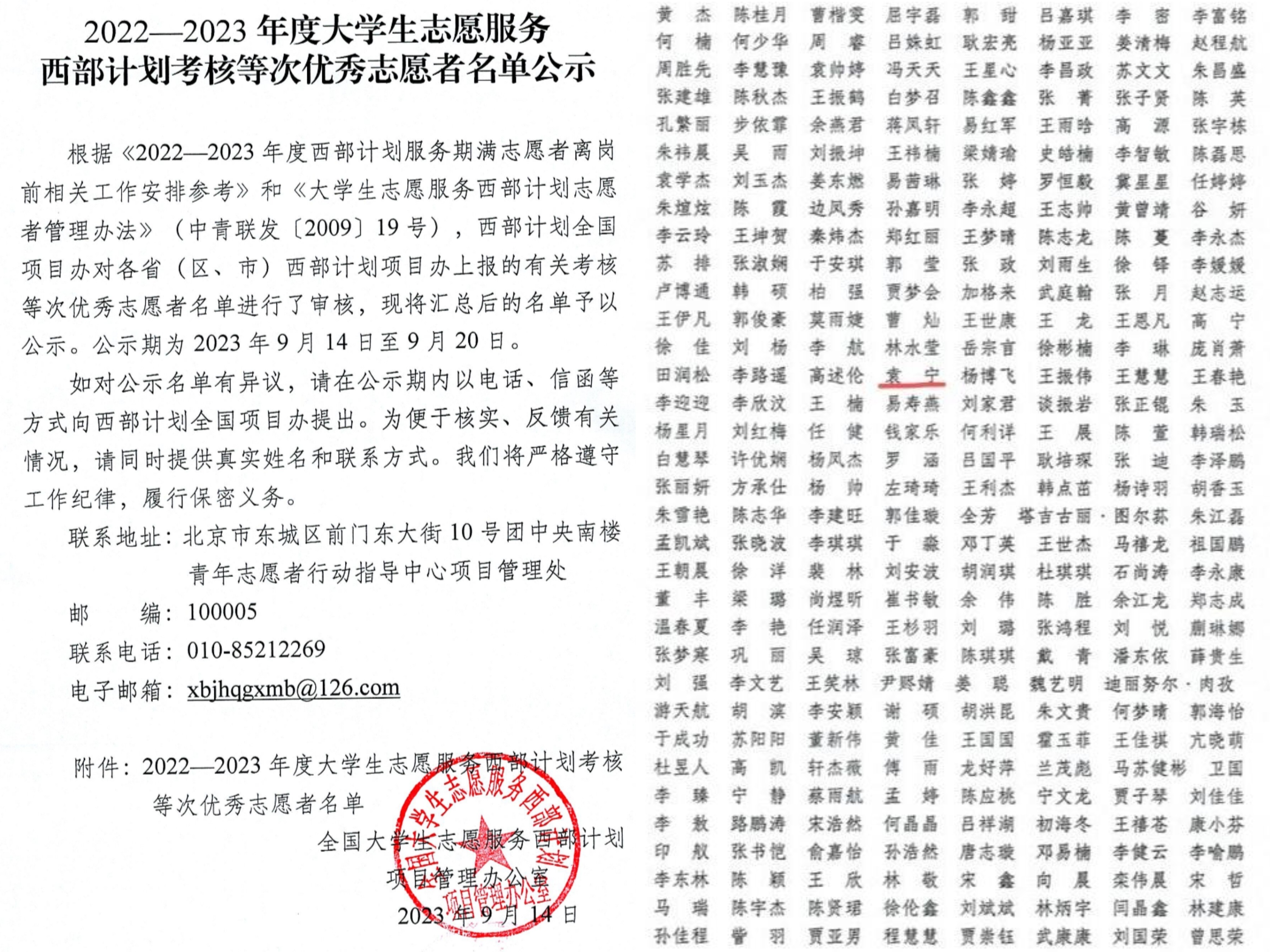 逐梦西部献青春,建功立业显担当。全国大学生志愿服务西部计划项目管理办公室今日下发了《2022-2023年度大学生志愿服务西部计划考核等次优秀志愿者名单公示》。我校2018级袁宁同学获评2022-2023年度大学生志愿服务西部计划考核优秀等次!