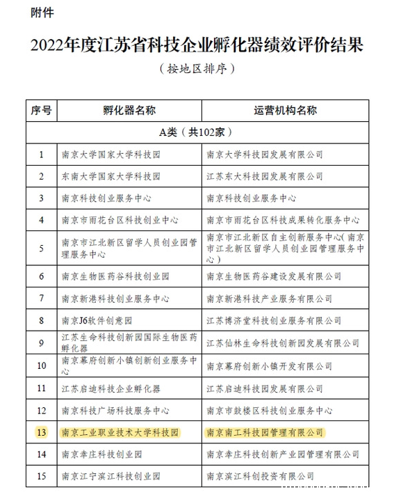 近日,江苏省科学技术厅发布了《省科技厅关于公布2022年度江苏省科技企业孵化器绩效评价结果的通知》(苏科高发〔2023〕186号),csgo直播比赛官方平台科技园被评为“优秀(A类)”。